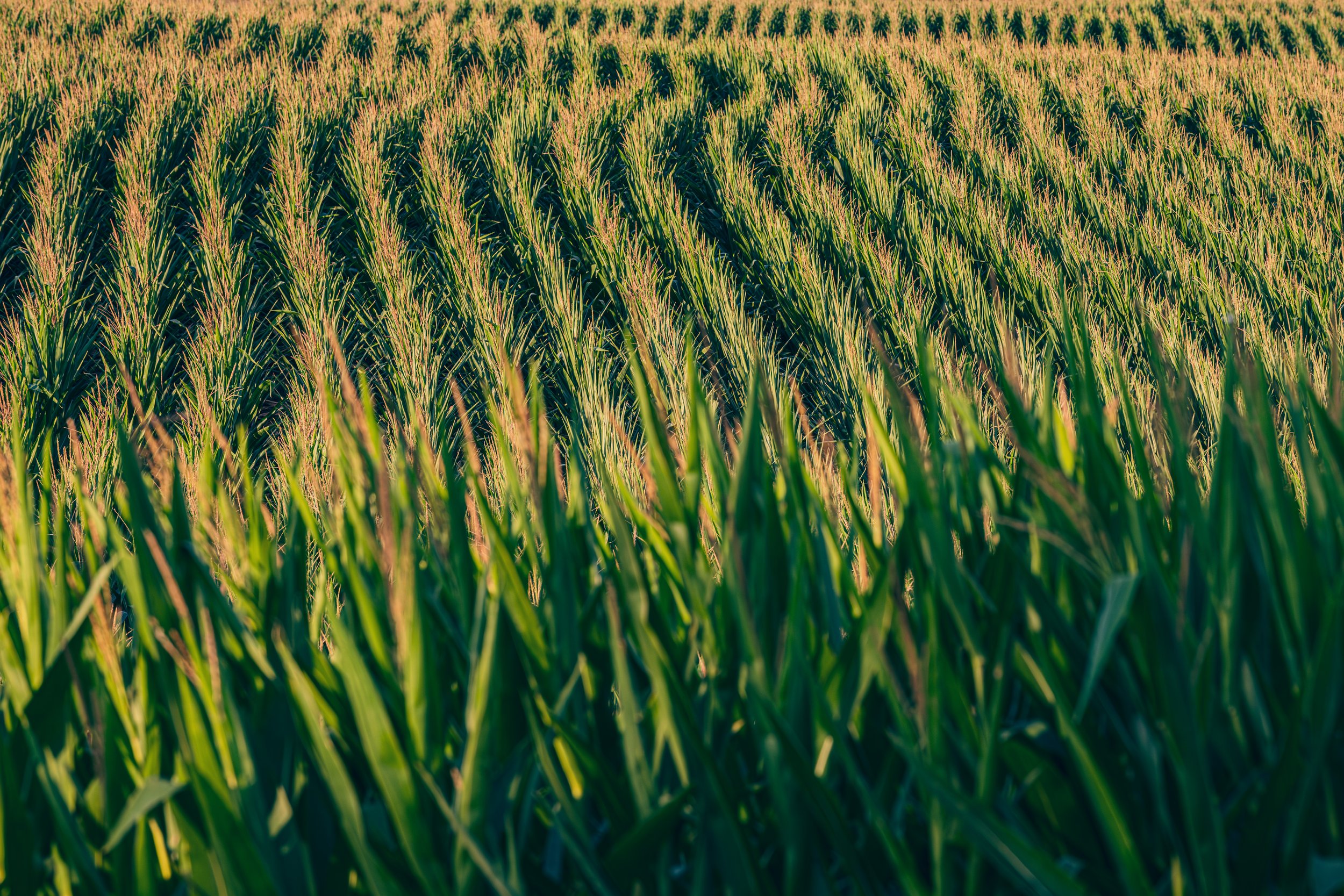 At sunset, the rows of corn curved like ribbons across the land—ordinary lines made luminous by the light.