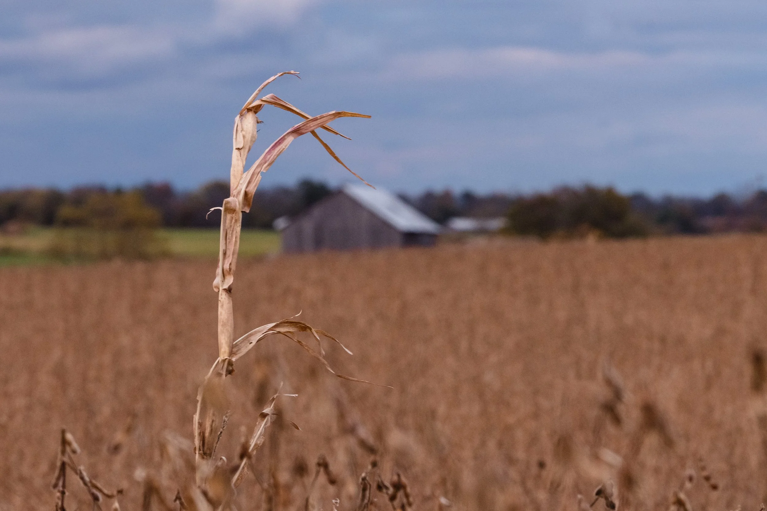 Amid rows of brown soy, one corn stalk stood tall—stretching as if to touch the roof of the barn beyond.